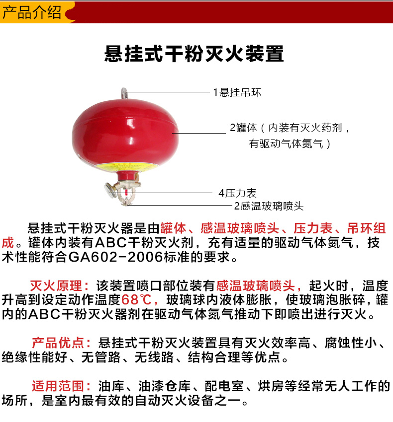 悬挂式干粉灭火装置在喷淋头的喷嘴处部位装有感温玻璃球,在正常情况下,玻璃球的上端顶住喷嘴处的密封片。起火时,温度升高,玻璃球内的液体因受热膨胀后自动胀碎,密封片自动跌落,灭火装置内的干粉药剂在氮气作用下自喷嘴喷出,进行灭火。本系列产品灭火装置具有灭火速度快,灭火药剂毒性低,使用安全等特点。