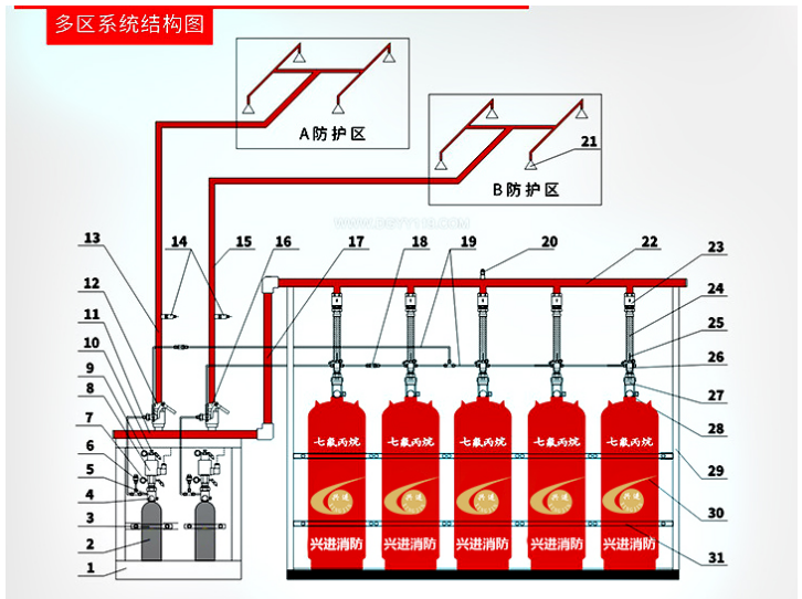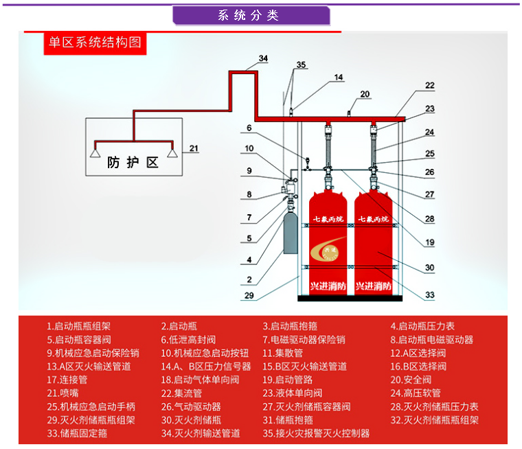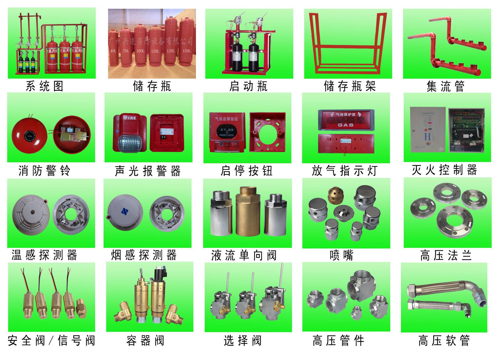 七氟丙烷自动灭火系统由储存瓶组、储存瓶组架、N2启动钢瓶组,启动钢瓶组架、瓶头阀、液流单向阀、气流单向阀、电磁启动器、输气控制管路、集流管、选择阀、三通、异径三通、弯头、异径弯头、法兰、安全阀、压力信号发送器、管网、喷嘴、药剂、火灾探测器、气体灭火控制器、声光报器、警铃、放气指示灯、紧急启动/停止按扭等组成。